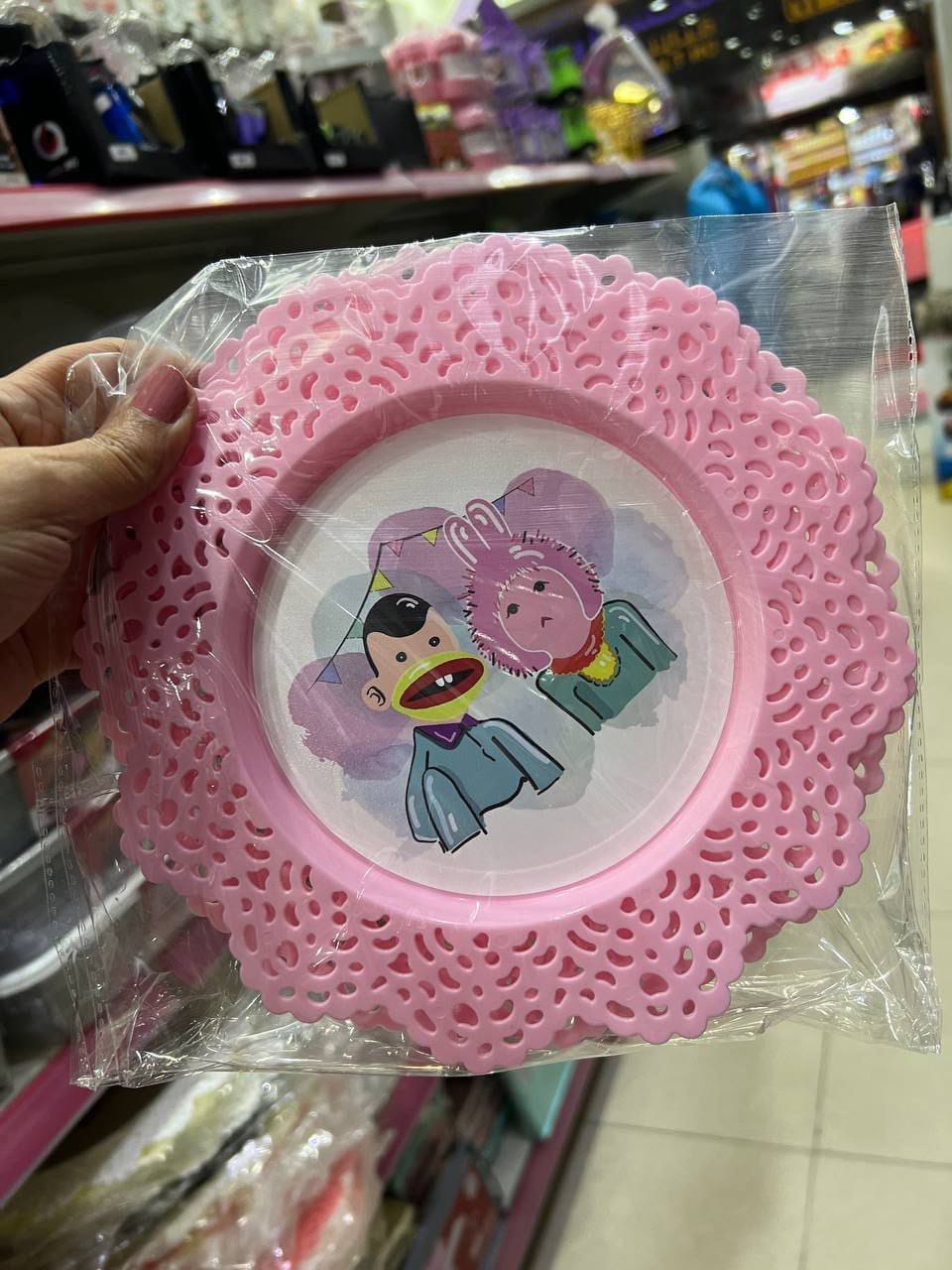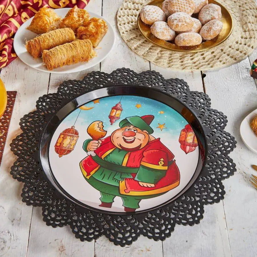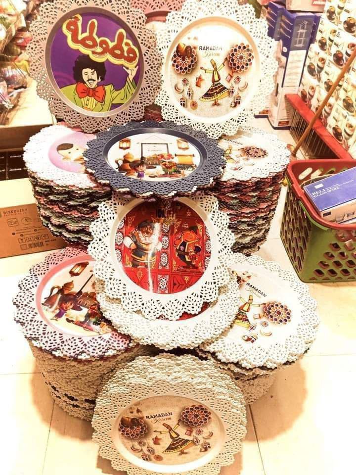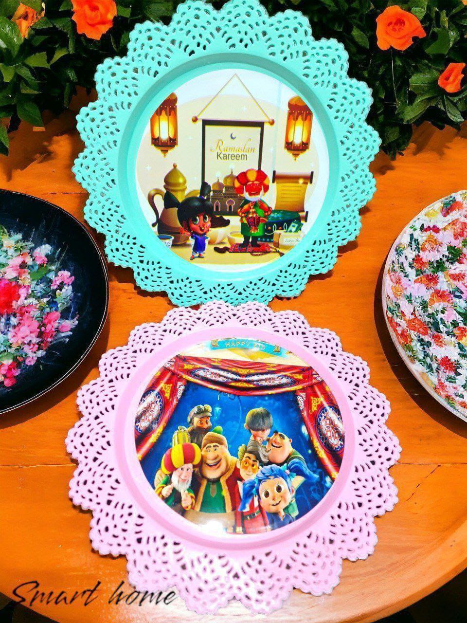 طبق بلاستيك مدوره بأطراف دانتيل شيك جدا ورقيقه وكمان مطبوعه بأشكال وشخصيات رمضان المحببة